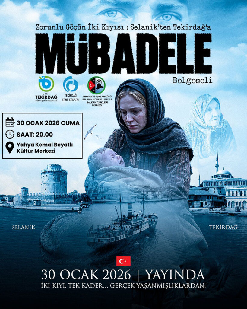 “Zorunlu Göç’ün İki Kıyısı: Selanik’ten Tekirdağ’a Mübadele” adlı belgsel 30 Ocak Cuma akşamı saat: 20.00’da Yahya Kemal Beyatlı Kültür Merkezi’nde. ücretsiz izlenebilir.
