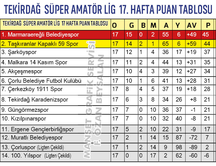 Buna göre Tekirdağ Süper Amatör Lig’de 17 hafta tamamlan müsabakalar sonunda puan tablosu şu şekilde oluştu.